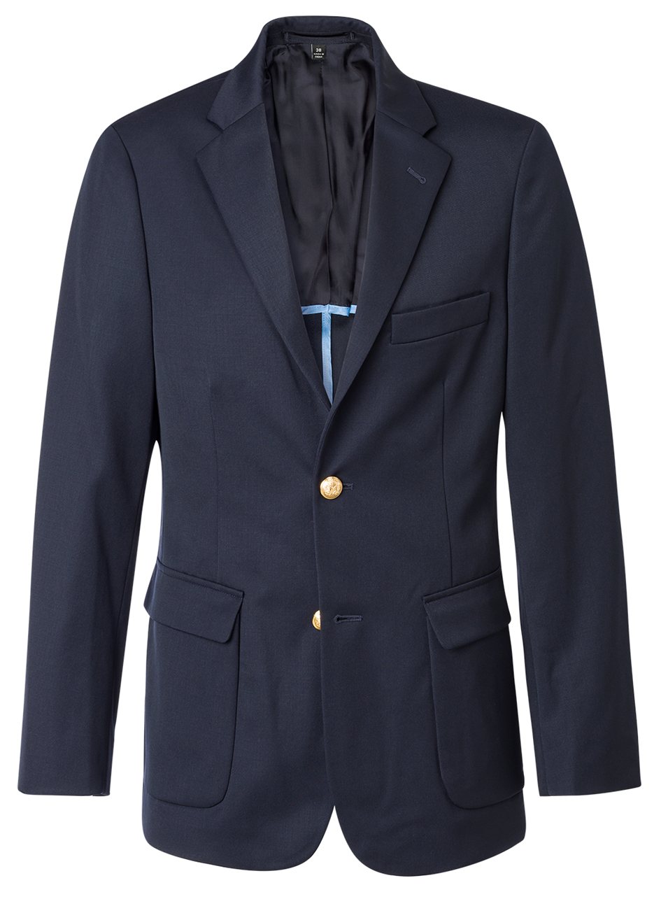 Niven Blazer (No. 3765). Light pure twill wool. Half lined. Antiqued brass buttons (two in front, four on each sleeve). 3" lapels. Slightly suppressed waist to complete rakish silhouette. Two interior chest pockets. Flapped patch pockets at hip. Double back vents. Imported.